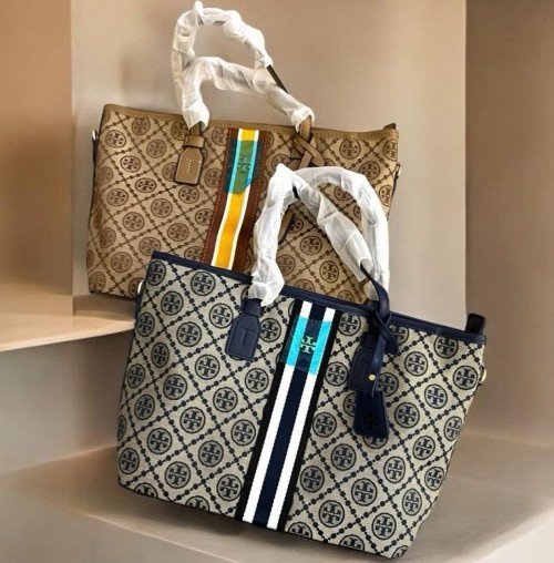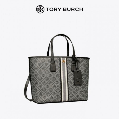 Tory Burch T Monogram Coated Canvas Tote Bag Navy With Dust Bag